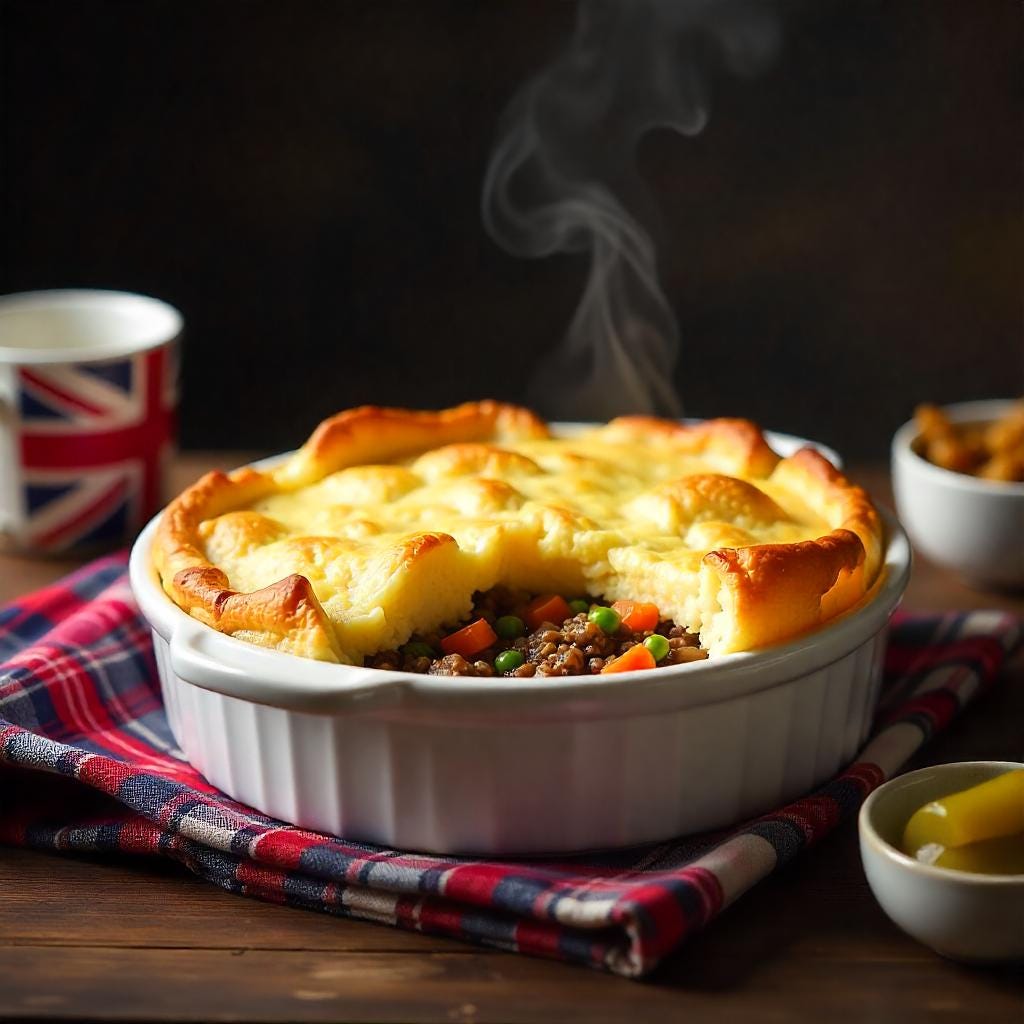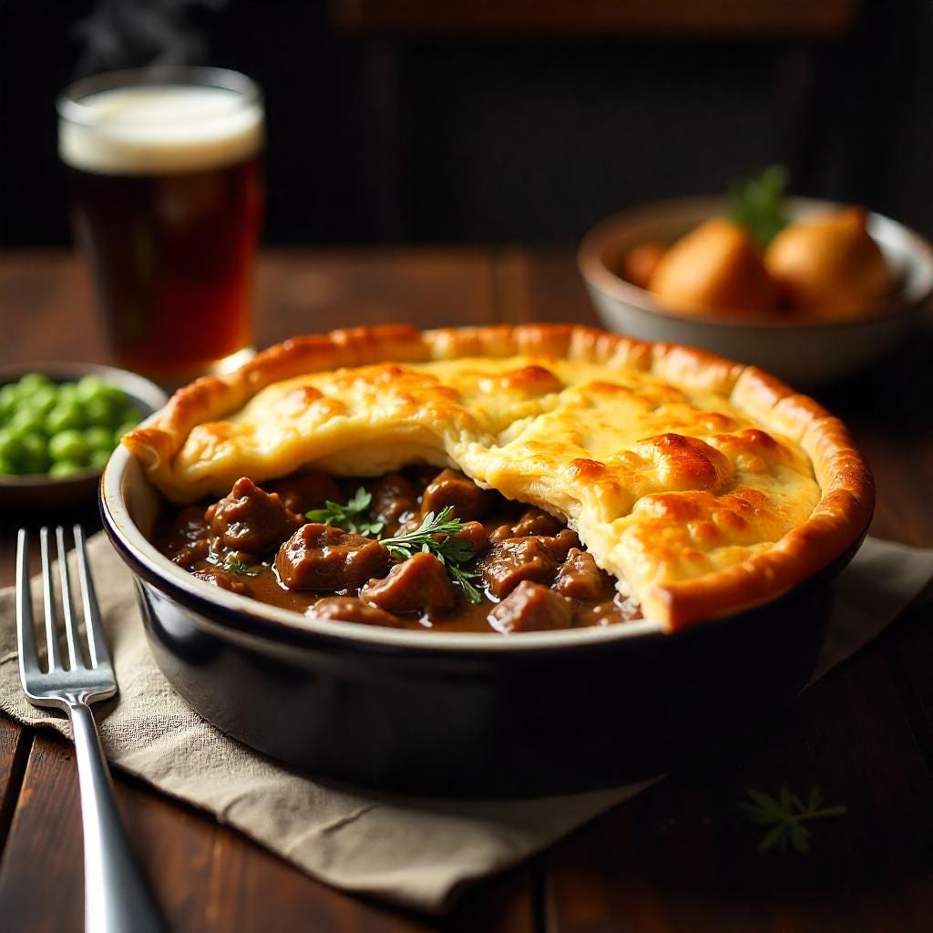 This slow-cooked British meat pie features tender steak and kidney in savory gravy, wrapped in flaky pastry. Found in every proper British pub, it's a cornerstone of traditional UK cuisine.