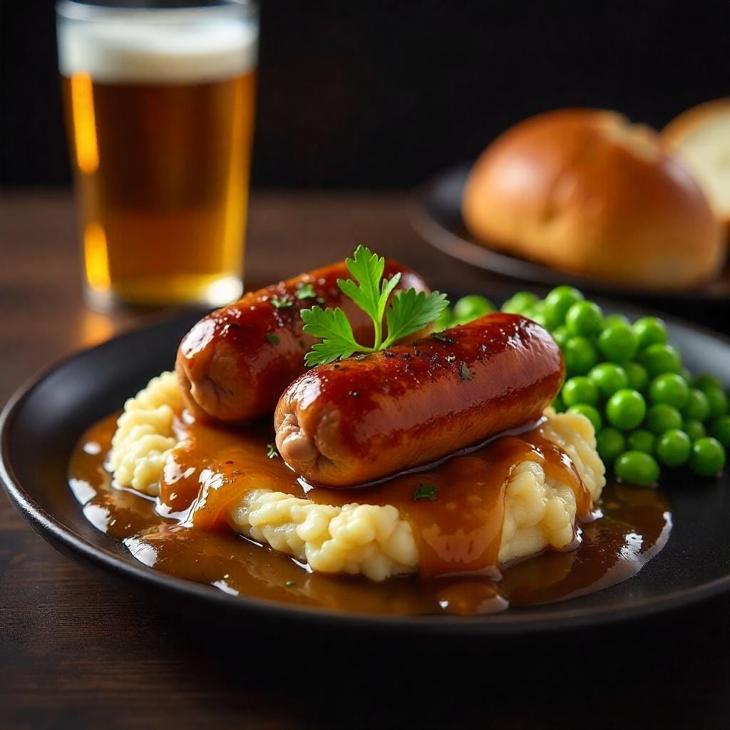 Sausages served over mashed potatoes with onion gravy—this British pub food classic proves comfort can be simple. A staple across UK households and pubs.